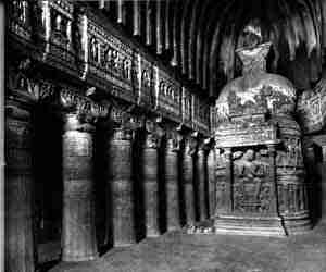 This chaitya hall is inside one of the 29 caves cut into living rock at Ajanta, India, over a period of 800 years. A stupa sits at the back of the hall.