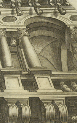 Tommaso Laureti (Italian, 1530-1602), Design for a portion of an illusionistic ceiling, 1583, engraving, 8 3/8 x 12 5/8 inches, From Giacomo Barozzi da Vignola, Le due regole della prospettiva pratica, Rome, 1583, p. 88, Getty Research Institute, Malibu, CA.