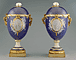 France, Sèvres, Royal Porcelain Factory, about 1769, Pair of Lidded Vases, painted reserves attributed to Jean-Baptiste-Etienne Genest, porcelain painter, soft-paste porcelain, blue Fallot ground, gilding, gilt-bronze mounts, 3 feet 6 1/4 x 3 feet 3 3/4 x 1 foot 2 inches (107.3 x 101 x 35.5 cm), J. Paul Getty Museum, Malibu, CA. See vase.